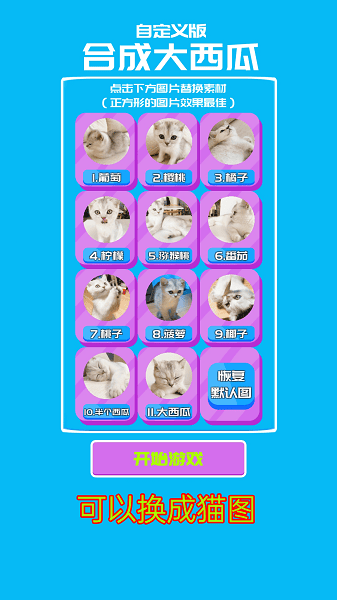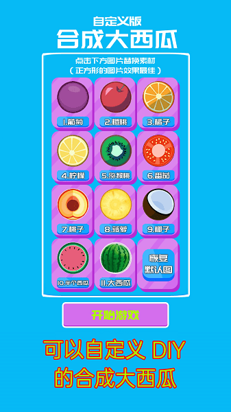 自定义合成大西瓜游戏是最近非常火爆的小游戏合成大西瓜的改版,玩家可以自己定义合成的图案,然后开始合成各种其他的东西,十分的有趣模型,还能恶搞。