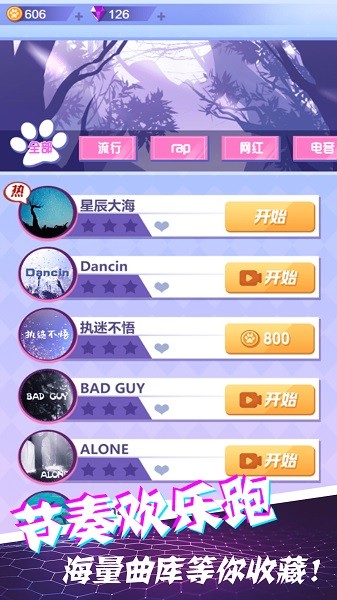 节奏欢乐跑游戏有着华丽酷炫的画风,操控角色进行跑酷,享受充满激情的竞速闯关,躲避障碍、使用道具,多种皮肤可以自由选择,海量的曲库资源,节奏感直接拉满。