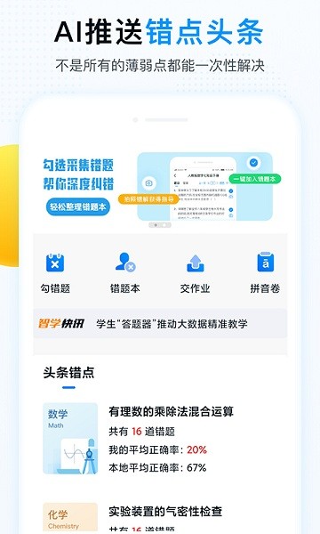 帮助学校建设智能题库和智能作业编写系统,在不改变老师批改习惯下,学生在校用答题器、在家用手机提交选择题答案或勾选错题,师生依据学情报告精准教与学,智能管理错题,老师一键发布个性化、分层作业,学生重做错题,加练相似题,靶向纠错。