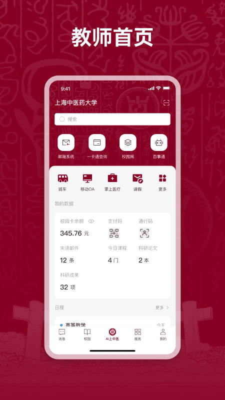 “AI上中医”是上海中医药大学推出的官方移动服务平台,是面向上海中医药大学师生提供的一站式资讯和应用服务的官方应用。