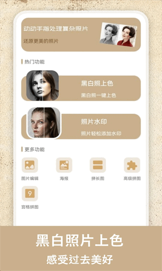 老照片上色是款实用的照片修图软件,你可以将一些老照片进行上色,并且你还能查看前后对比情况,用户还能添加照片水印,这里还有很多其他功能。你可以将多张图片拼接在一起,并将其发在社交平台上