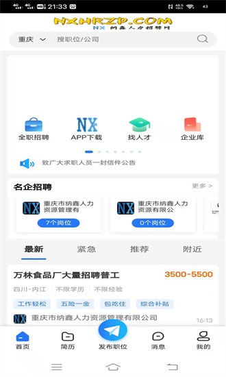 应用平台:Android应用官网:http://www.nxhrzp.com应用厂商:重庆纳鑫人力资源管理有限公司