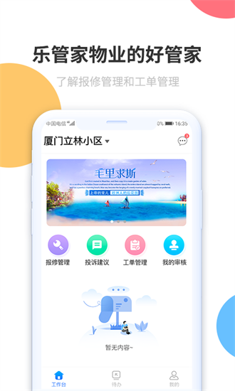 【功能介绍】报修管理、投诉建议、工单管理、管家服务、物业巡更等常用社区服务管理功能;