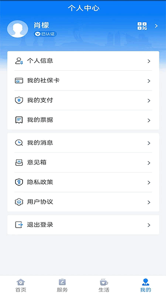 个人信息、社保卡、支付、票据、消息、意见箱、隐私政策与用户协议等集中管理,查找与维护更方便。