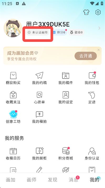 4、返回【我的】页面,点击昵称下方的【未认证画师】;