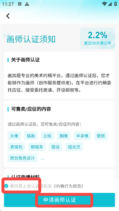 6、阅读画师认证须知,勾选同意后,点击【申请画师认证】;