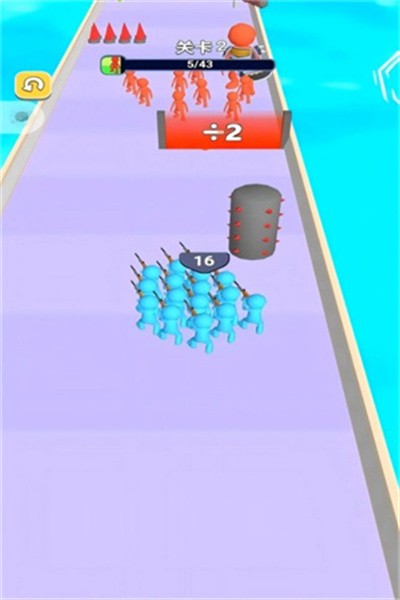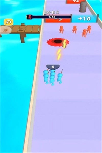 1、点击开始按钮,进入关卡1,操控蓝色小人军团向前冲锋。