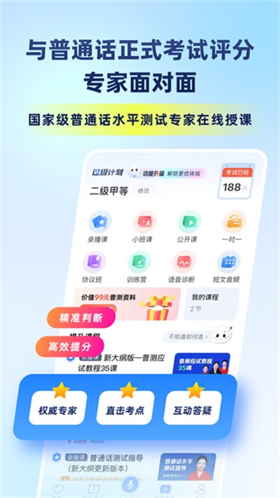 1.开设名师实时直播课程,国家级测试员线上讲解发音技巧,直观纠正表达错误,加快普通话水平提升速度。