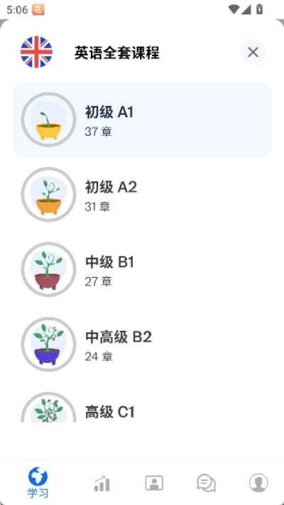 4、确认当前语言学习等级,例如初级A1阶段后,按章节顺序逐步展开对应内容学习流程。
