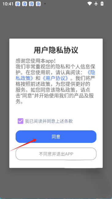 1、启动影记投屏助手应用后,界面会弹出相关使用说明与服务协议提示,阅读页面内容后点击同意按钮进入软件主界面,完成基础授权步骤后即可开始使用投屏相关功能。