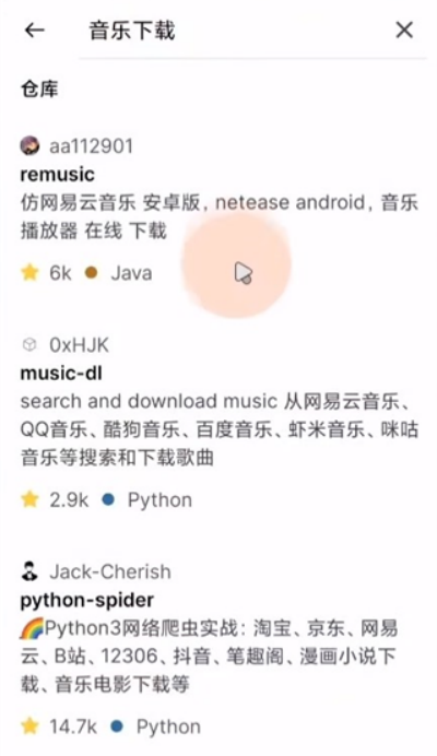 2、在搜索框输入关键词如音乐下载,即可获取相关源码项目结果。
