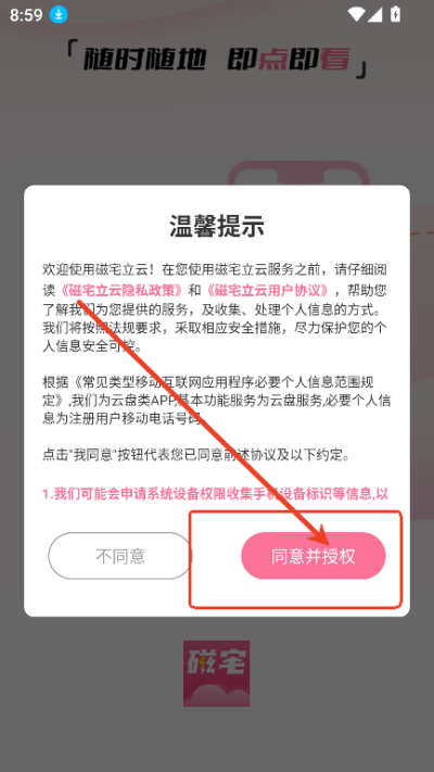 1、打开磁宅立云App后,首先会进入启动权限提示页面,需要点击“同意并授权”完成基础权限确认,这一步用于保证软件具备正常运行所需的访问条件,完成后才能继续进入下一步操作界面。