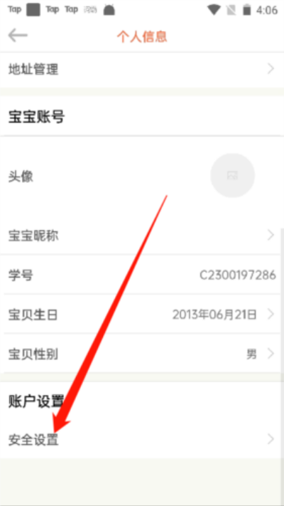 2、在个人信息页面向下滑动找到“安全设置”选项并点击进入相关设置。