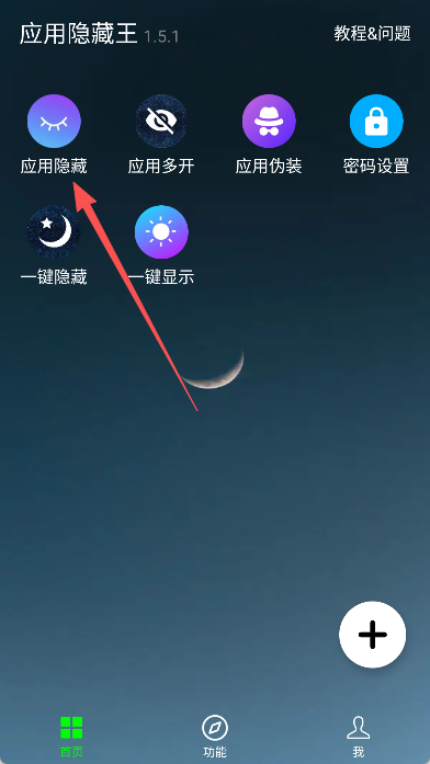1、打开应用隐藏王app,进入软件首页,在界面中找到并点击“应用隐藏”功能入口,进入应用管理页面。