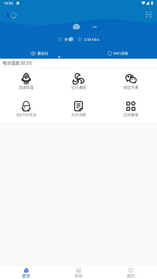 1、进入旋风清理App后默认进入首页,可使用加速降温、空间清理与文件清理等多种手机优化功能。