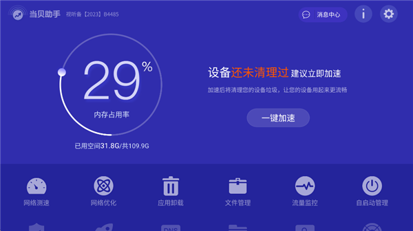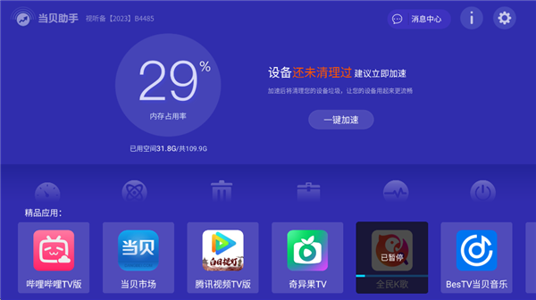 当贝助手TV版是一款专为智能电视打造的系统优化与管理工具软件,由当贝市场官方推出,集内存清理、应用管理、网络优化与系统加速等功能于一体,通过智能扫描与一键优化机制帮助用户快速清理电视缓存与冗余文件,释放存储空间并提升运行流畅度,同时支持自启动管理与网络测速等实用功能,有效改善电视卡顿问题,让设备保持稳定高效运行状态,并提升整体使用体验与响应速度。