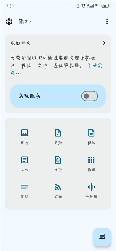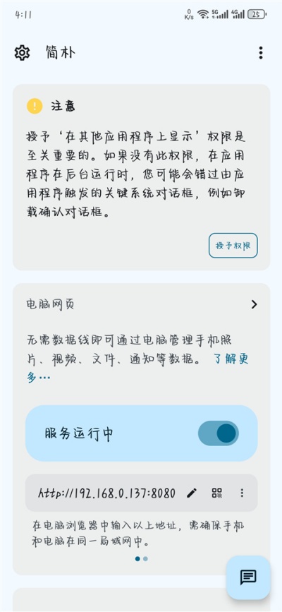 1、启动简朴App后,点击开始服务以激活手机与电脑的连接功能。