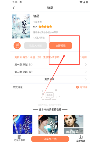 3、搜索到目标小说后,进入小说详情页,找到页面中的“立即阅读”按钮并点击,快速进入小说阅读界面。