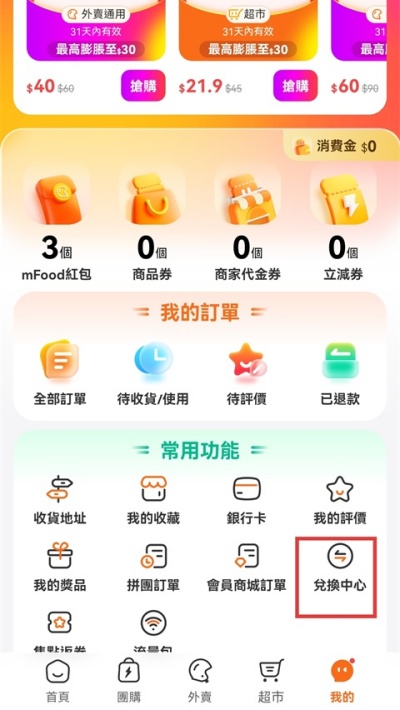 1、打开mFood App,进入【我的】页面,点击【兑换中心】选项。