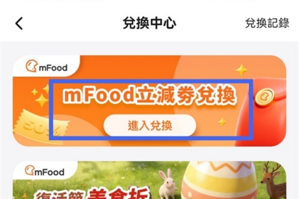 2、点击【mFood立减券兑换中心】,进入券码兑换页面。