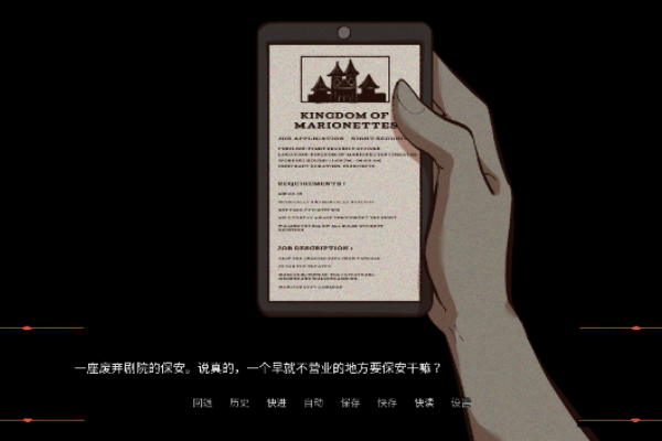 木偶王国(Kingdom of Marionettes)是一款由独立开发者Thepipi制作的乙女向视觉小说恐怖游戏,整体以剧情叙事与角色互动为核心体验。故事发生在一座被废弃已久的人偶剧场中,玩家将以新入职保安的身份开始夜间值班工作,在看似安静破旧的环境中执行巡逻、清理与安保任务。随着夜幕降临,剧场内部逐渐出现异常现象,原本静止的人偶开始产生行动,部分甚至仿佛被赋予了生命,在剧场各处活动。玩家需要在危险与未知中维持秩序,同时与这些神秘人偶进行交流互动,通过不同选择推动剧情发展。随着深入探索,隐藏在剧场背后的秘密也将逐步揭开,整体故事融合恐怖氛围与情感互动体验,带来独特的叙事沉浸感。