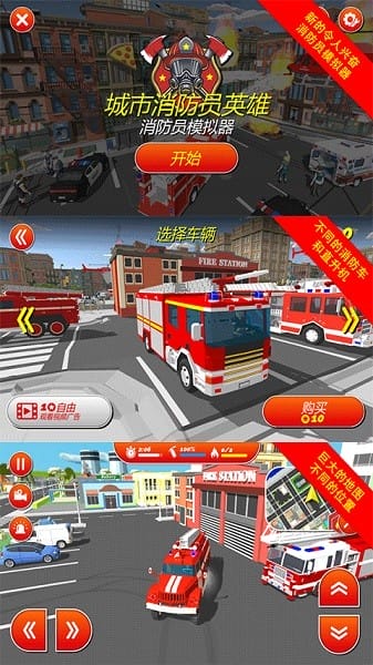 2、丰富多样的救援任务中灵活的应对不同的火灾情况,完成使命赢取奖励升级消防车