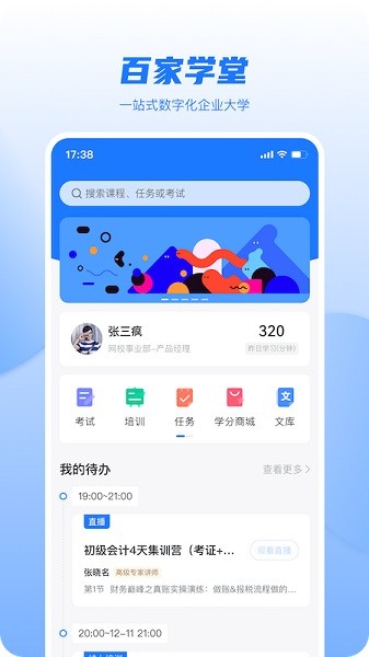 百家学堂app是为企业培训员工的首选应用,适用于全场景式的解决方案,集成了学习、考试、商城等功能,有着丰富的课程资源,专业老师提供详细的讲解。