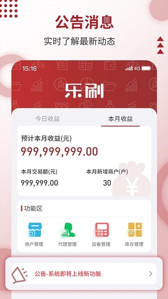 乐刷展业版app作为服务商们进行团队管理的首选展业应用,本app提供了相当完善的功能服务,商户、代理、设备、库存等等一键化管理,服务数据随时汇总,查询更简单。