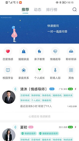提供恋爱情感,婚姻关系,亲子教育,情绪疏导,家庭关系,校园学业,个人成长,职场人际等心理咨询辅导服务。