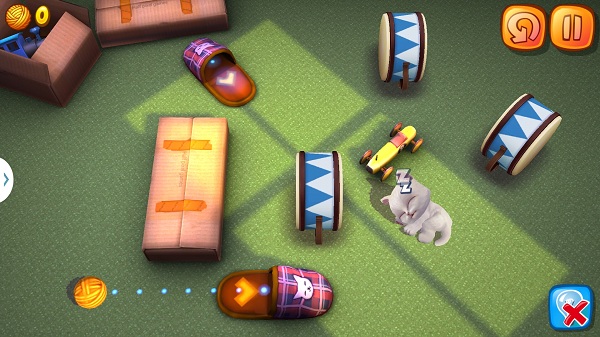 游戏的玩法很简单,只要将毛线球弄到小猫的旁边,它就会自然的醒过来,划屏从毛线球上拖出一根方向指示的箭头,放手后毛线球就会自动的按照玩家规定的方向和力度前进。