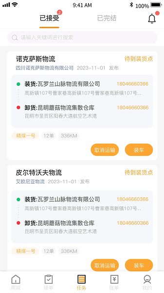 2、司机端功能强大:给指定物流商下单、司机抢单,实时预估发货费用,提供货物跟踪、回款状态、回单状态跟踪功能。