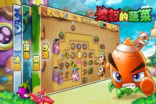 愤怒的蔬菜游戏有着十分清新耐看的画风。玩家需要帮助蔬菜们保卫家园,抵御坏人的进攻。有各种蔬菜可以布置抵御敌人,不同的蔬菜有着不同的技能效果,还能不断的升级,不要让敌人得逞,击败他们。