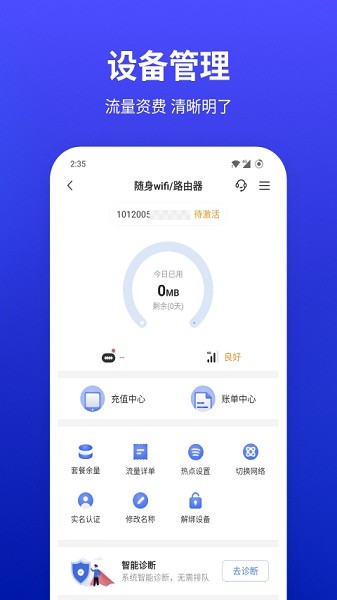 一款集充值和设备管理的全新APP,为用户提供快速绑卡认证、流量充值、流量查询、设备管理、设备租售、客服支持于一体的专用功能性软件。可管理路由器、随身wifi、流量卡等多种类产品。