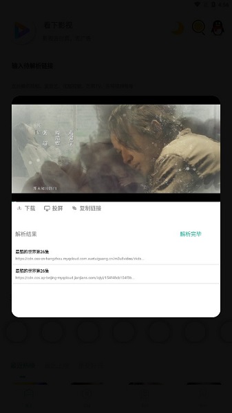 看下影视app作为一款免费追剧软件,主要由这两大亮点,其一是内含海量的影视资源,各种类型全都包括,用户可以直接点击播放,其二就是强大的视频解析功能,能够将视频直接解析出来,免费看,支持多个主流视频平台。