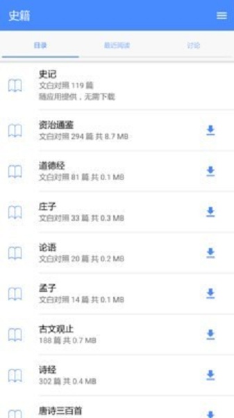 很方便也很好用的一款阅读器应用,只是不同的是里面既不是小说也不是优美散文,而是全部都是史籍,收录的是史记、汉书以及古文观止;