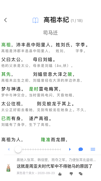 支持一键搜索,每段古文后面都有详细的注释以及翻译,难懂的字还有拼音的注释,支持字体大小的切换以及文白对照的设置,繁体简体自由选择。