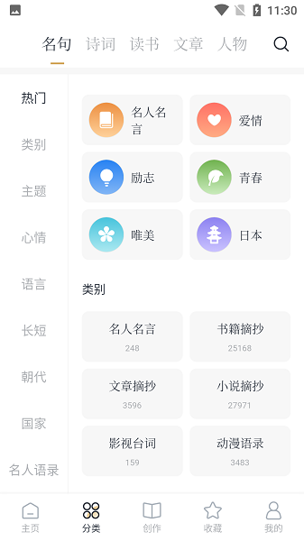 五千年沉淀的不同体裁的诗词全收录,包括古诗、楚辞、唐诗、宋词、元曲,以田园、山水、送别、爱情、友情、饮酒、思想、战争、边塞、壮志、怀古、爱国、孤独、悼亡等为不同维度进行归类。