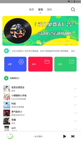 专业推荐,装机必备!拥有超多热门歌曲,各个都是免费音乐试听,可一键搜索出你想要的音乐,歌曲瞬间弹出,界面清爽无任何广告弹窗,满足用户各种听歌的口味。