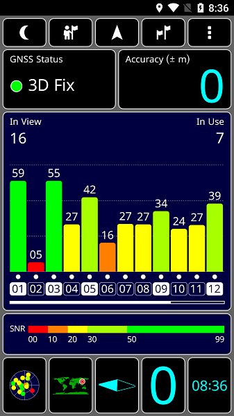 GPS信号(SNR),条形图,显示出每颗卫星的信号强度,以及精度和GPS状态。