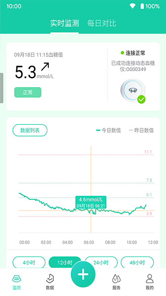 监测:采用实时动态血糖监测设备,通过蓝牙传输到APP中,帮助糖友随时看到自身糖尿病数据,为自我血糖管理提供数据帮助