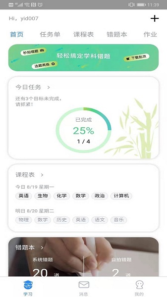 为学生提供了查看考试成绩、线上交作业、日常测验等学习环节,也为学生提供了错题本整理、分享打印、错题视频讲解、错题推荐试题等有效帮助提高学习成绩的学习内容。同时也为学生提供了课程表、任务单等学习辅助工具,帮助学生记录待办事项和准备课上书本。