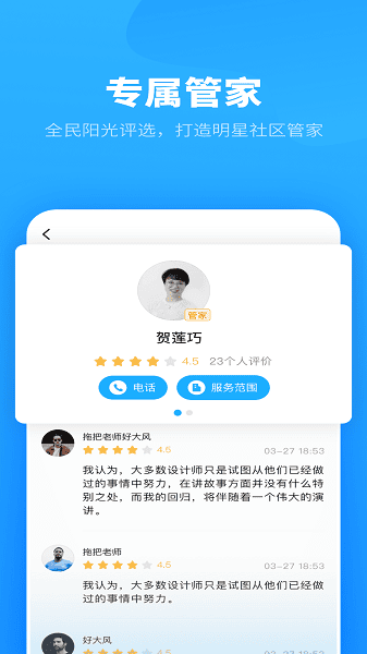 用户在软件中能够清晰看到各个管家的服务范围,一键拨打管家电话