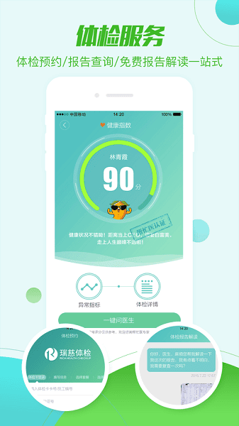 拥有丰富的互联网和医疗行业资源及经验,致力于打造用户健康管理的一站式服务,能够方便快捷实现体检预约、体检报告查询、免费解读体检报告,是您掌上健康管理专家。