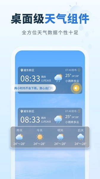 实时天气状况:生动形象的动态背景,清晰展示当前温度、湿度、体感温度和风向,更有智能详细的语音播报