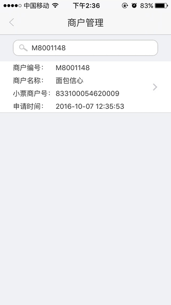 1、首页点击“商户管理”,进入商户查询页面,输入商户编号或者商户名称,输入法框点击搜索,显示商户列表