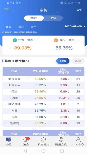 展示丰富的航班正常情况列表,该正常情况表格中提供了机场、放行正常率以及环比等数据