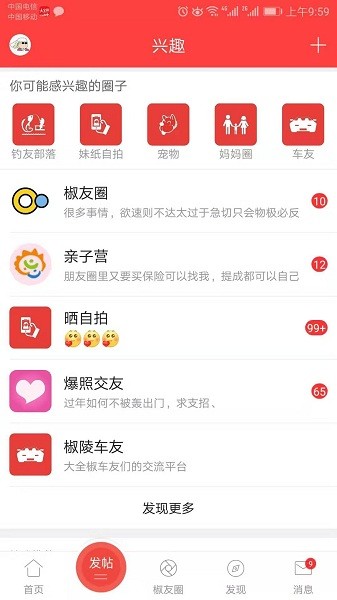 拥有丰富的兴趣圈子,包括了亲子圈、钓鱼圈、宠物圈、车友圈