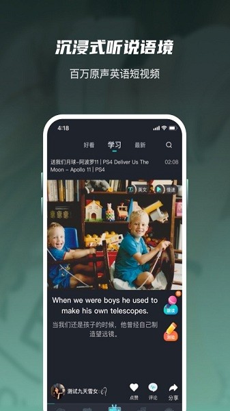 属于有趣又高效的英语学习软件,让你在兴趣中主动学习。软件通过精准评估A1-C2的英语水平,推荐适合你水平的学习素材,高效学英语。