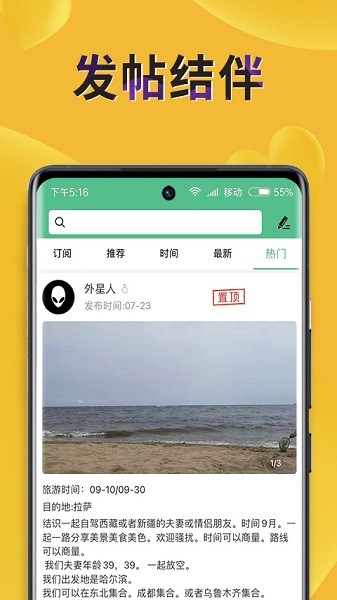 一键发布旅行,在此发布自己旅行的话就能在此找到具备同一个目的地的驴友