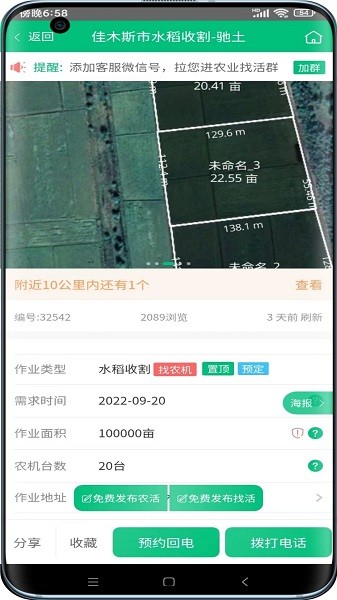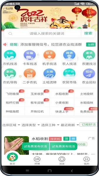 专业的农业招工找活平台,并提供农机交易租赁、农村土地流转、农资批发零售、农产品交易买卖、农业招标采购等,覆盖耕种管收售全程的农业生产托管服务。